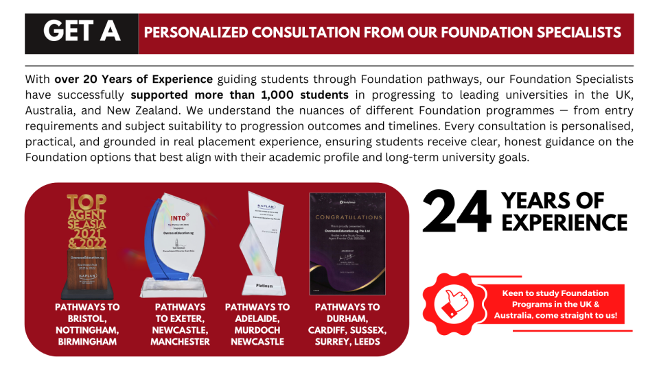 What's Next After O Levels? Thinking of Applying to Foundation and proceed to a UK, Australia or New Zealand University in less than a year! Come down to our event and find out more on more than 50+ Foundation Programs in the UK & Australia through a 1 hour or more consultation! For those who are ready to apply, you can apply to multiple Universities Foundation Programs on the spot and we will waive the application fee for you. Scholarships available!